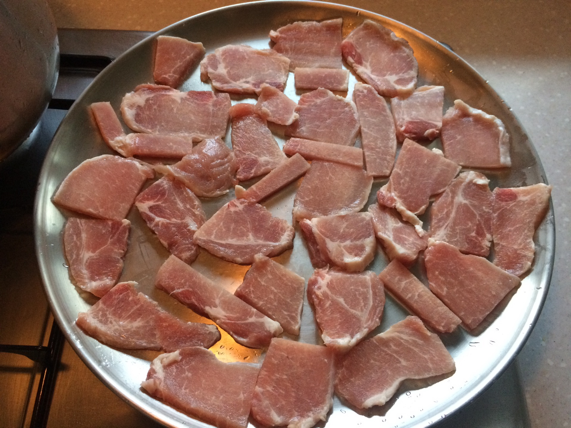 먹을 만큼 썰어서 녹은 고기는 말고, 덜 녹아 서걱거리는 녀석들만 스뎅 쟁반에 올려요.