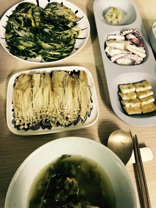저녁은 냉이된장국과 깻잎순조림, 달래장 얹은 두부구이, 팽이가 갈락말락해서 급 올라간 팽이버섯구이,