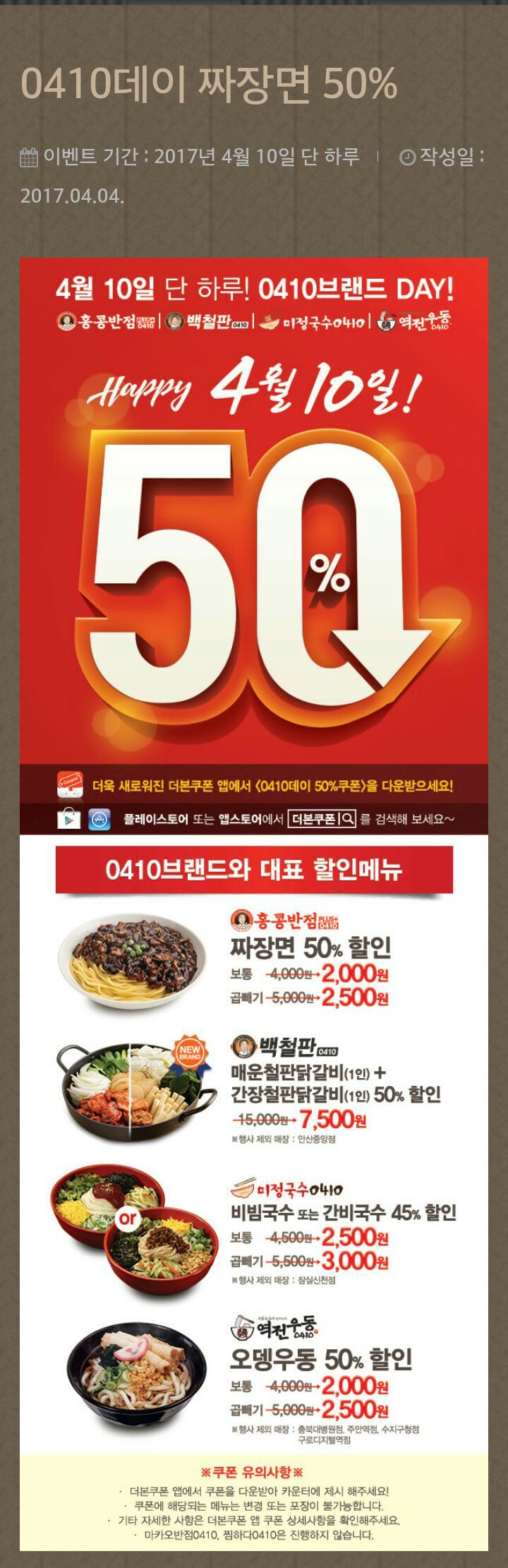 0410DAY를 맞이하여 홍콩반점0410에서 준비한 대박 50%할인 혜택!