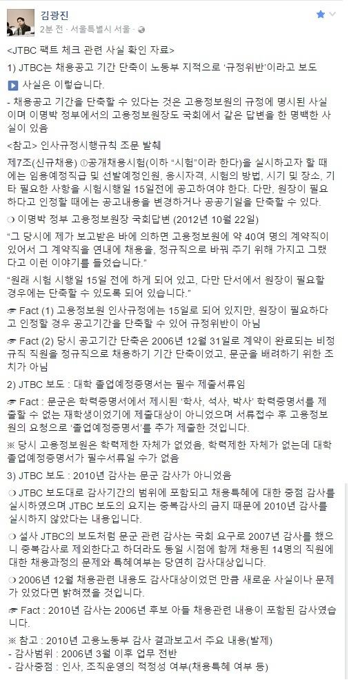 ​원장이 필요하다고 인정할 경우에는 공고기일을 단축할 수 있다. 고용정보원이 ‘기관주의 조치’를 받은 것은 사실이지만, 이는 당시 비정규직 재고용 과정에서의 문제였으며 문 후보 아들 채용 특혜와는 전혀 관련 없음.