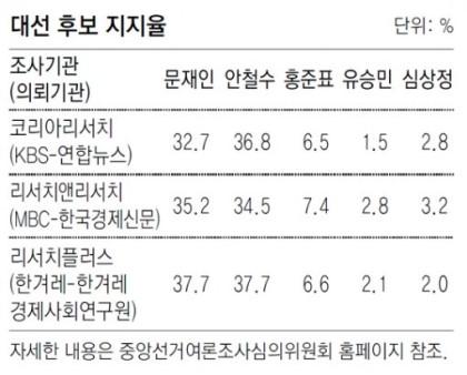 1. 대선 D-29… 문재인 vs 안철수 → 여론조사 마다 초접전. KBS-연합뉴스 조사에선 다자구도에서 安 첫 역전... 한겨레 조사에선 소수점까지 동률.(동아 외)▼