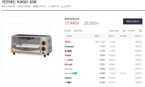 둘중에선 그나마 키친아트가 나을거에요(종종 들어본 브랜드). 참고로 15리터도 안되는 드롱기 2년간 썼었는데 이것저것 잘해먹었습니다. 쿠키 빵 피자... 크기 작아서 무지 불편하긴 하죠. 생선이나 고기 굽는건 비추에요. 기름 튀는데 내부 청소하기가 힘들어요. | ||