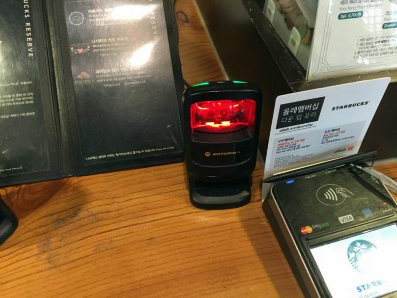 이마트 입점 스타벅스는 사이렌같은 포스기에 바코드 찍으면 인식되고 다른 매장은 없었네요. |