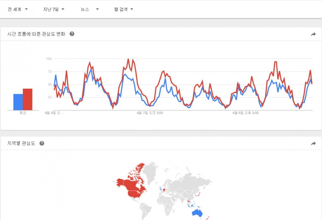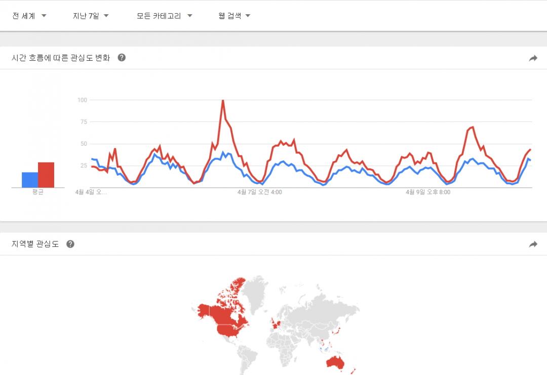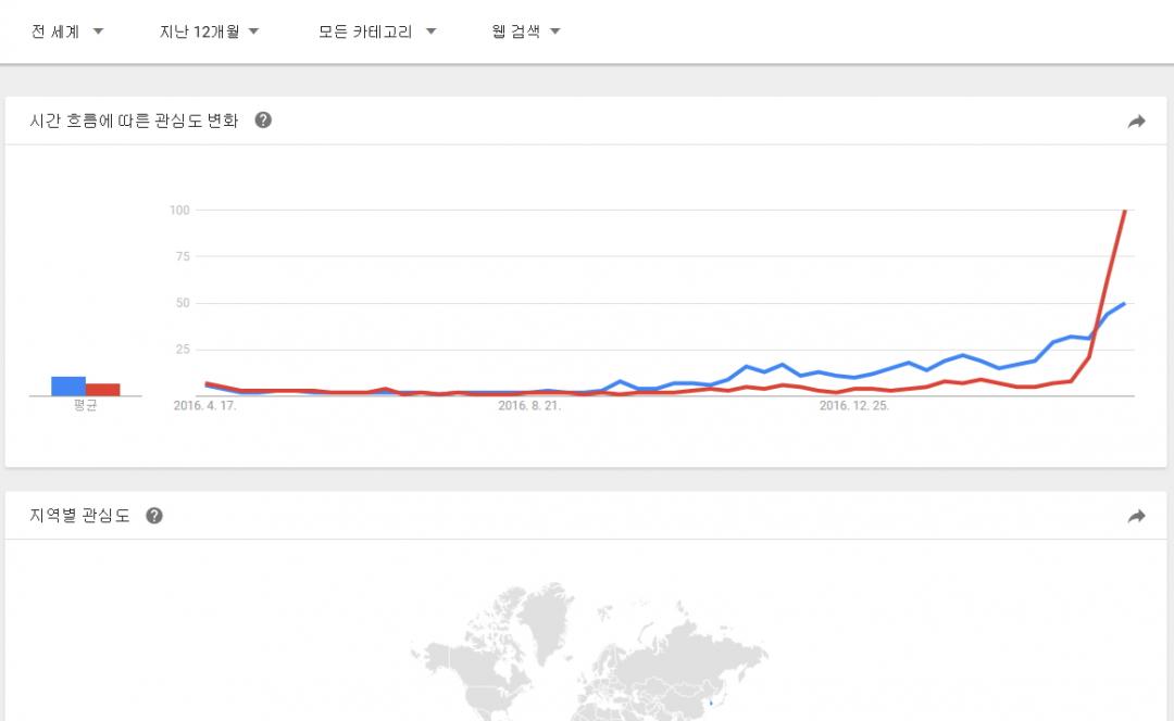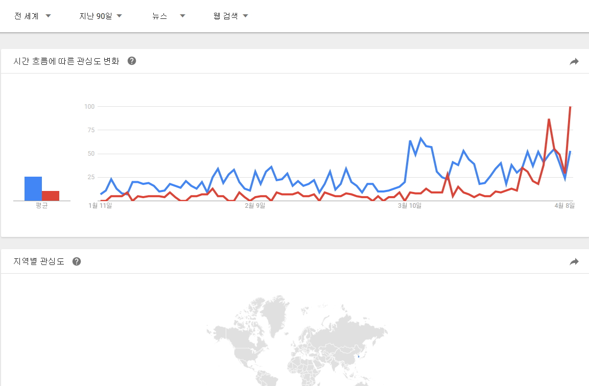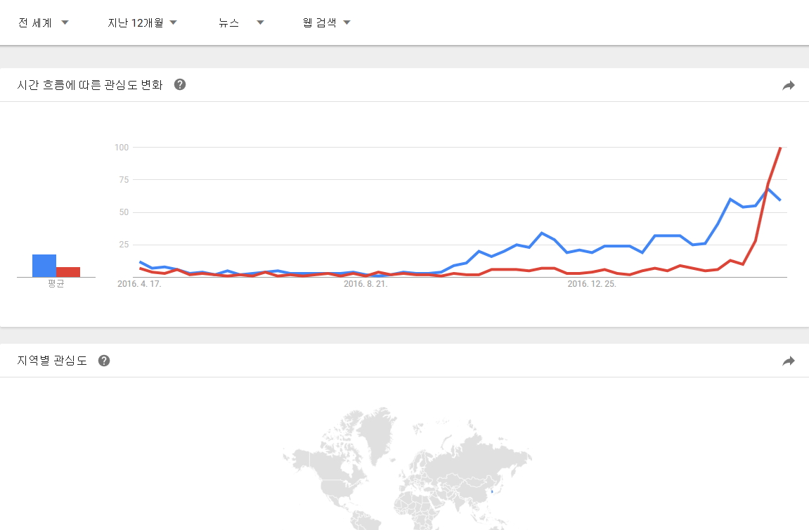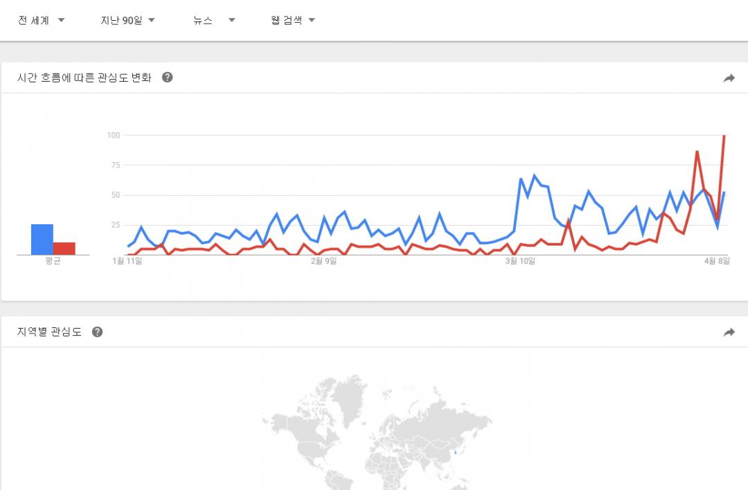 구글 트랜드에서 정의하는 뉴스 데이터 색인 기준을 모르겠지만 뉴스 제한으로 전세계, 대한민국 자료도 추가로 남깁니다. |