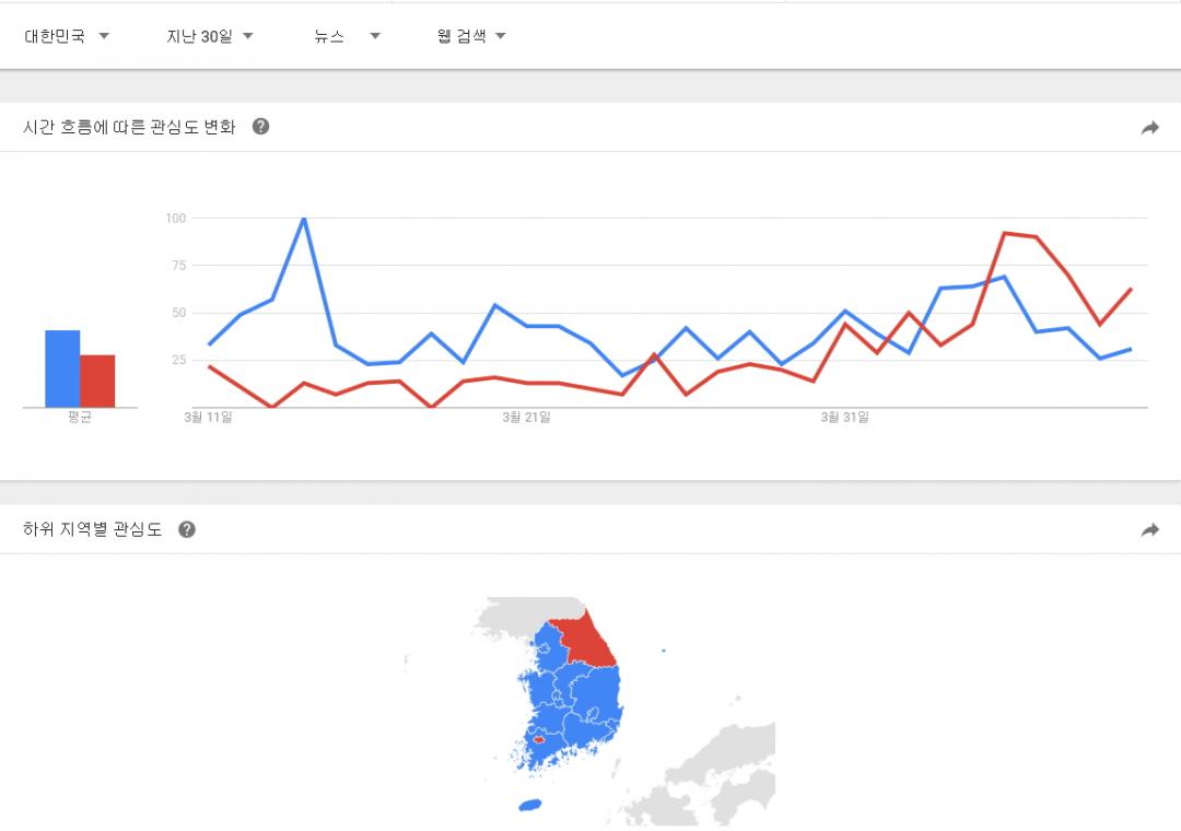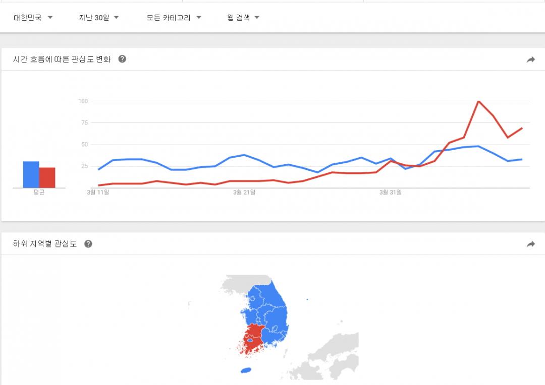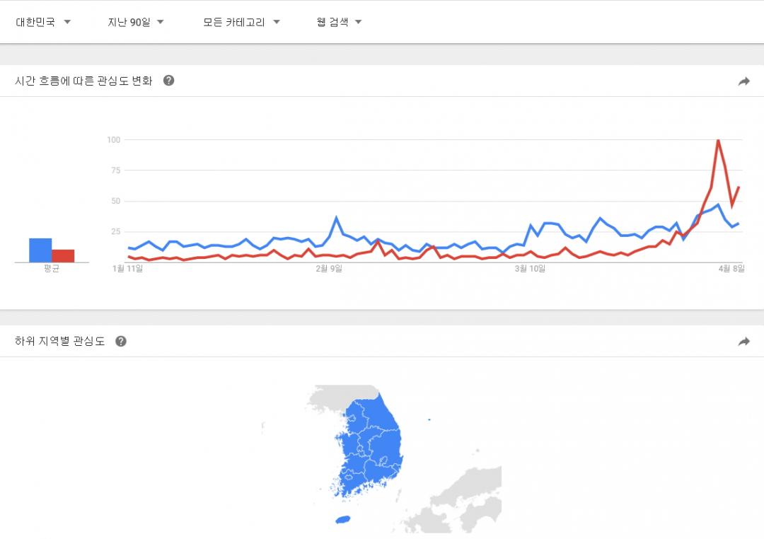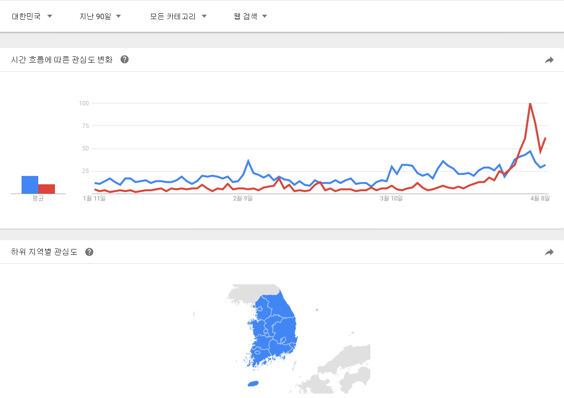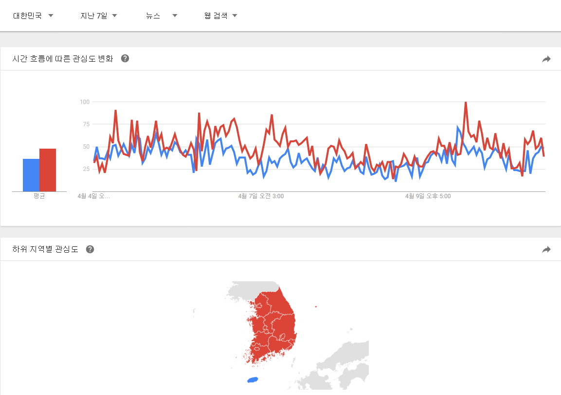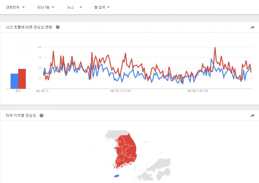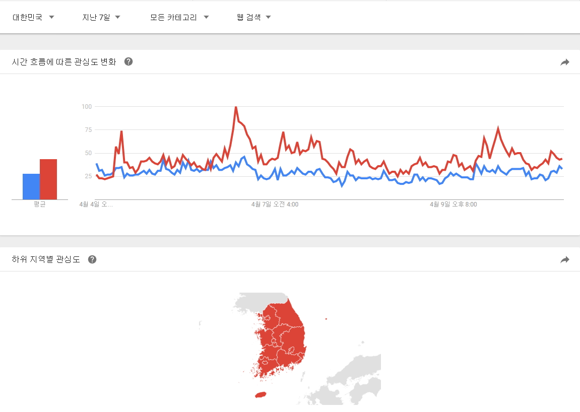 대한민국 제한으로 90일, 30일, 7일 그림에서의 관심도 점유율이 바뀌는 양상입니다.