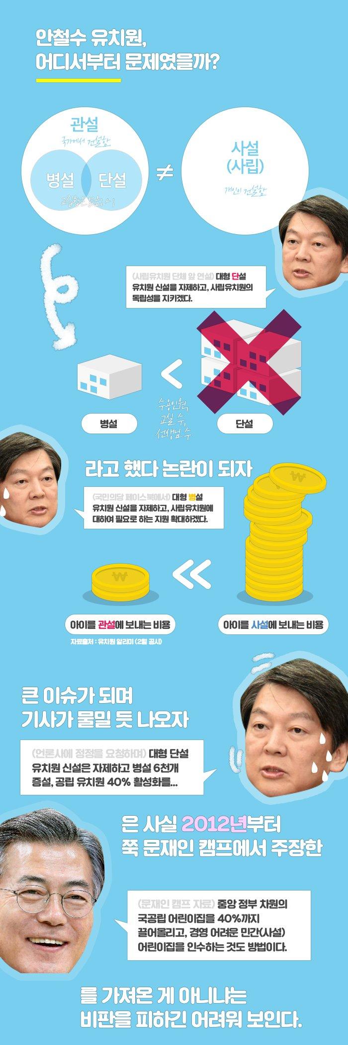 안철수가 처음부터 병설을 늘리겠다고 했던가요? 분명 병설 자제하고 사립 운영 보장한다고 했다가 오해다 단설이다라고 해명했죠? 병설이든 단설이든 공립유치원을 자제하겠다고 한 건 변함이 없습니다. 병설, 단설 개념도 모르고 해명이랍시고 했다가 여론이 더 안좋아지니까 부랴부랴 병설 6000학급 늘리겠다고 한거죠? 그마저도 이미 문재인이 2012년부터 얘기했던 거구요