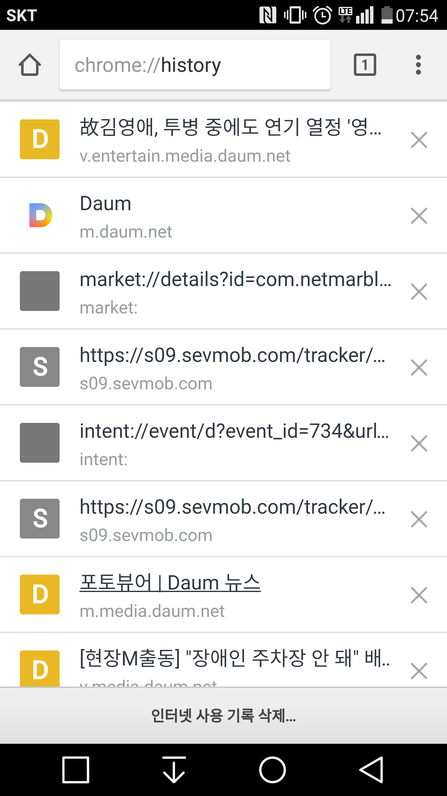새벽에 찜질방에서 자다가 잠이 일찍 깨고나서 잠이 안오는 바람에 딜바다 접속을 해서 자게글 읽는데 갑자기 구글크롬앱이 열리더니 이상한 페이지로 접속을 시도하는데 에러가 나서 열리지는 않았고 에러 페이지만 보여서 뒤로가기로 껐어요.. 다시 동일한 게시글을 열어보니 다시 같은 현상이 발생했어요.. 첨부파일의 접속기록 중간 부분에 나오는 sevmob.com으로 시작하는 싸이트예요. 그 다음껀 뭔지 모르겠고 연속해서 열리는 페이지였고.. 뒤로가기로 나왔다가 재접속했을 때 다시 sevmob.com 접속 기록 보이시죠?