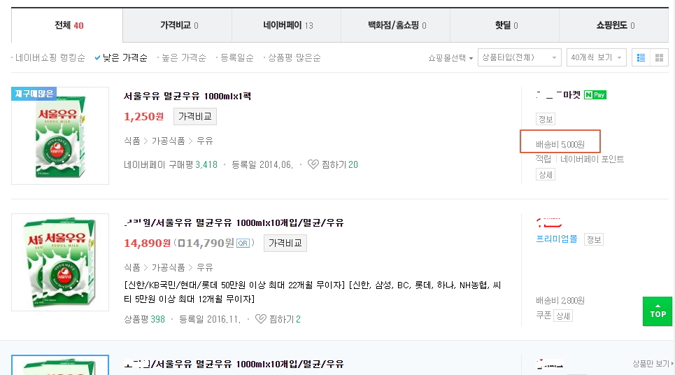 멸균우유 1000ML 가격 저렴한 것 있나 가끔 검색해보는데 최저가 설정해놓고 1250원 나오길래 보면 상품 자세히 보면 배송비 5000원이네요.