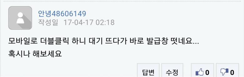 엥...저는 반응 있네요 연속 두번 누르면 대기창이 꺼지고 로딩 이미지 뜨면서 발급 되었다고 뜨네요 |