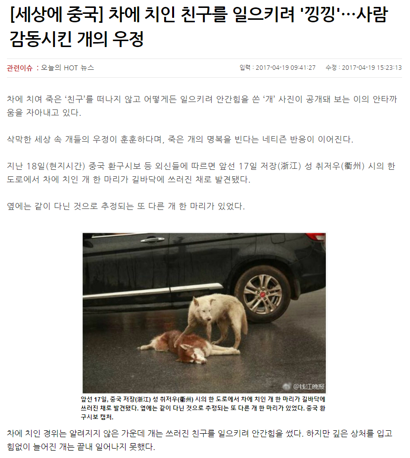차에 치인 친구를 일으키려 '낑낑'…사람 감동시킨 개의 우정 > 자유게시판