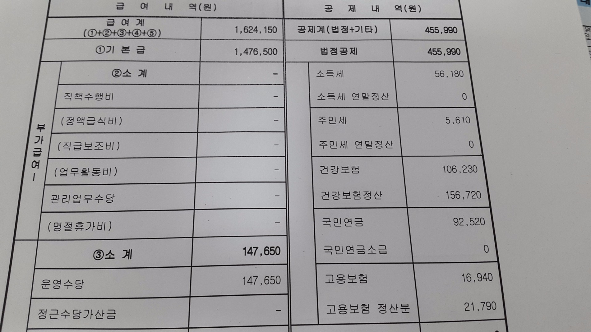 기본급 150도 안되는데 공제계가 45만원이 넘네요