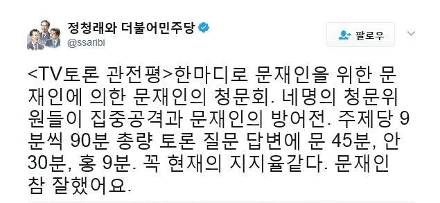 주적이 밖에 있는게 아니라 국내에 산적해있네요. 민주정부 10년을 폄하하는 자칭 진보후보라는 사람의 발언을 보고 정말 정내미 떨어지더군요. 뭐 박국정농단 세월호 참사 때 해경 해체한다는 것처럼 교육부 해체 한다는 공약 들고나온 후보는 공약도 제대로 설명 못하고. 적폐 두명은 서로 이정희네 염치없다는둥. |