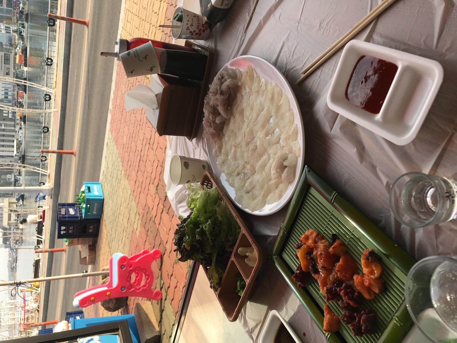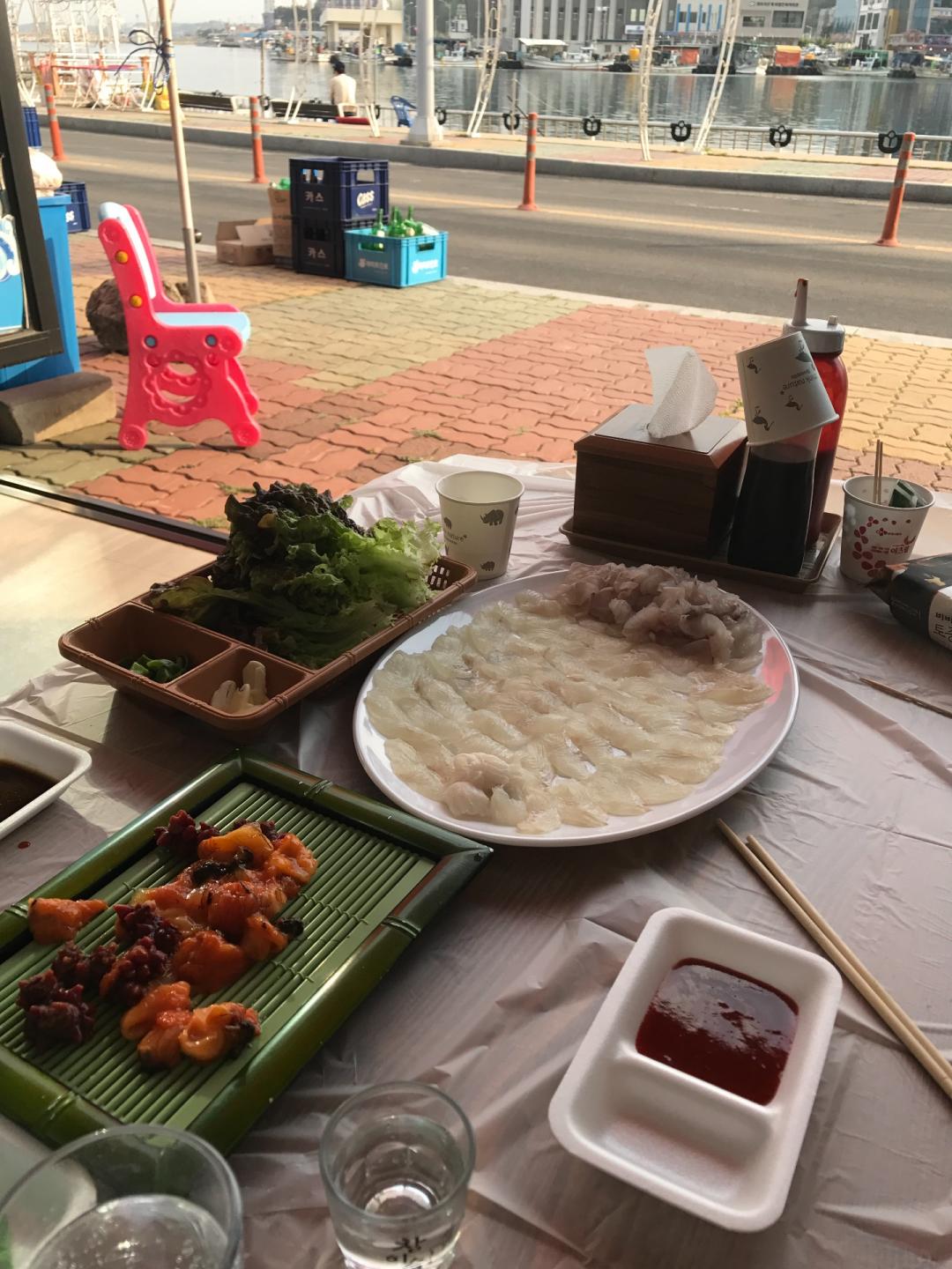 다섯시쯤 새우튀김집을 시작으로 포장해서 횟집들어가 아이 튀김과 밥먹이고 우린 회와 매운탕(여태 먹은 회와 매운탕중 최고였던!) 먹고 튀김집 다시가서 오징어순대 포장하고 술 사들고 숙소로!