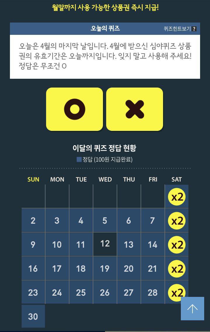 4월에 받으신 심야퀴즈 상품권의 유효기간은 오늘까지입니다.