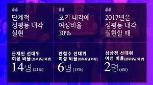 성평등 내각 이루겠다했으나 선대위 여성 비율 8%로 진보-중도 최하위권