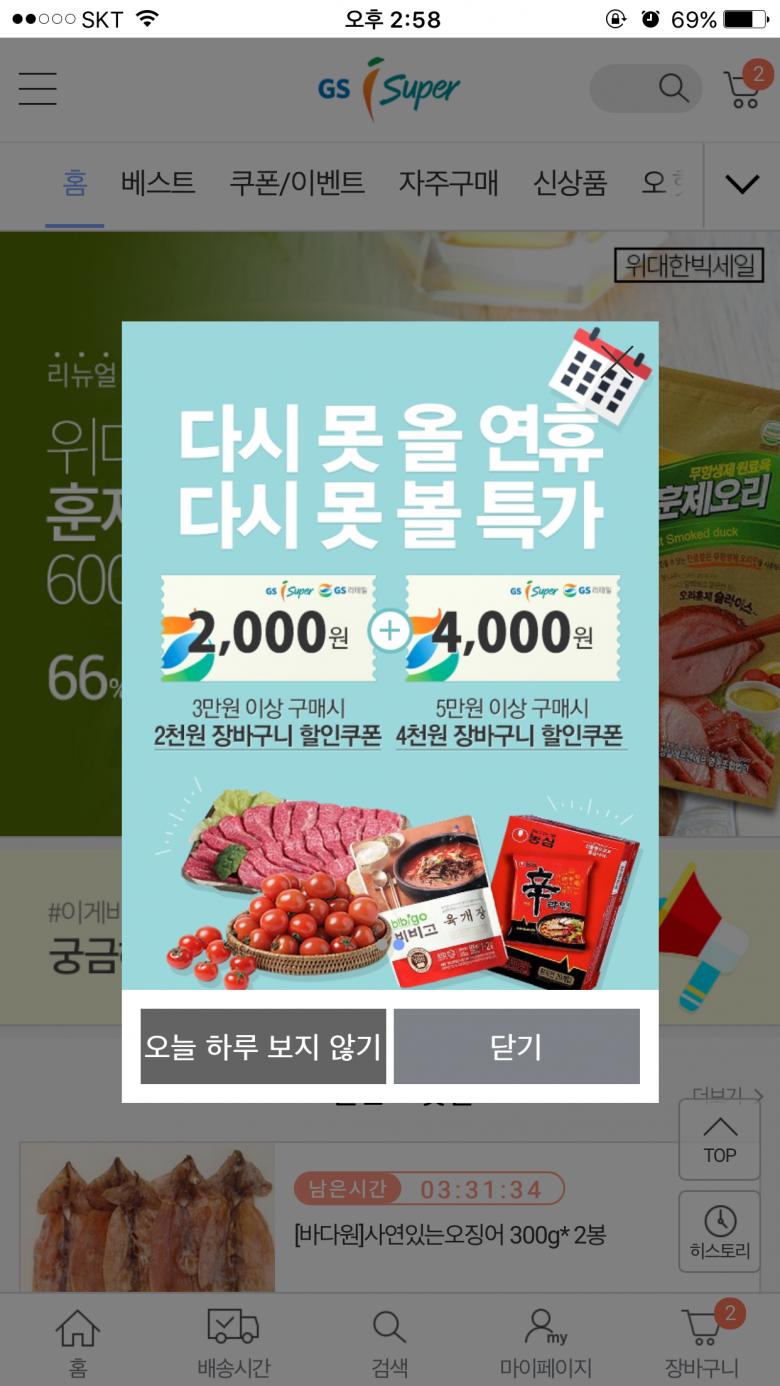 gs슈퍼 앱들어가심 메인팝업으로 장바구니 3만원이상 2천쿠폰 받으실수 있어요