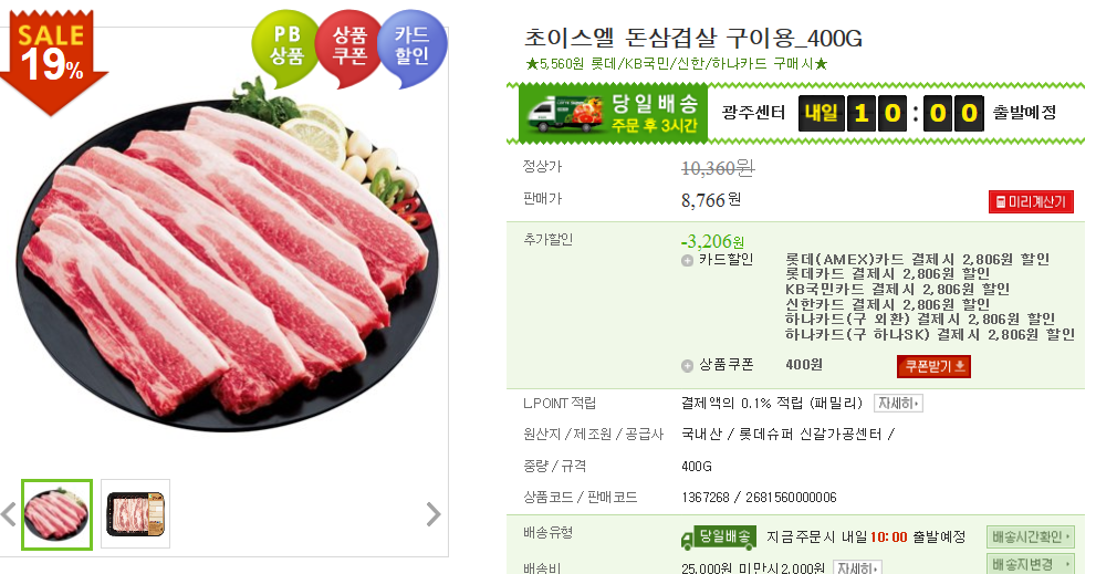 롯데포인트 + 카드 결제해도 삼겹살 2kg 19,740원에 구매했네요.