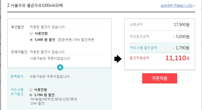 카드할인+30%(청춘쿠폰) 적용시 11100원 나옵니다