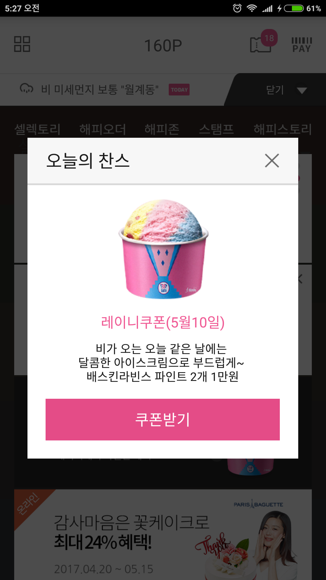 배스킨라빈스 파인트2개 만원 레이니쿠폰 발급되네요(해피포인트앱) > 자유게시판