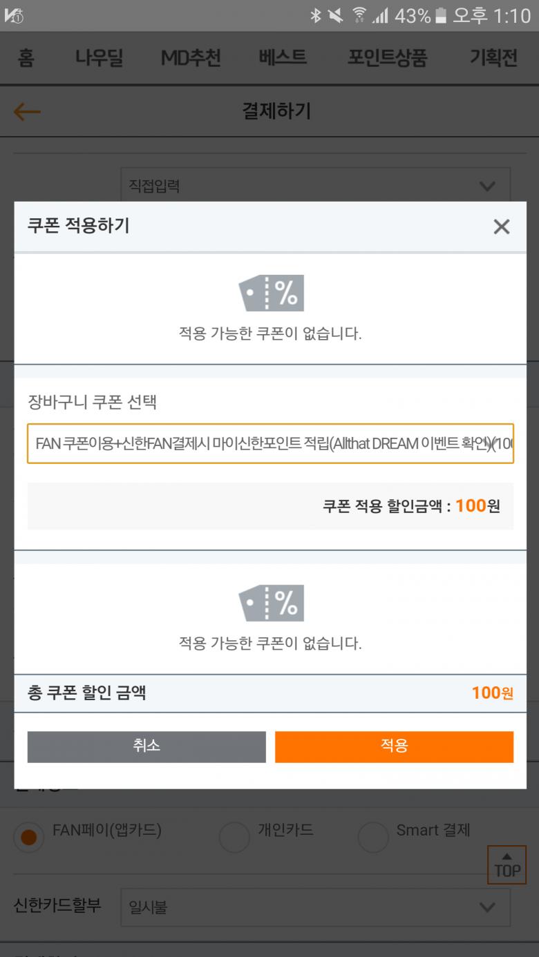 신한올댓 이번엔 일반 2000쿠폰이 적용이 없네요. > 자유게시판