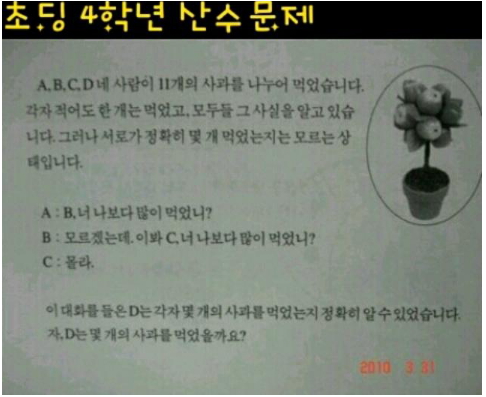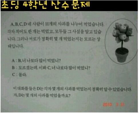 저 대화를 듣고 D가 몇개를 먹어야 알수있는지만 구하면 되는 문제네요. 수식은 다음분이 구해주실거에요.ㅋㅋㅋ |