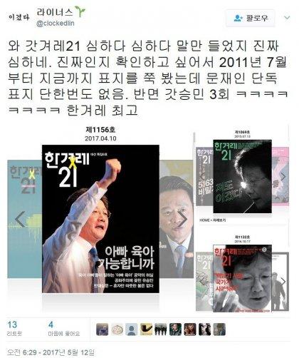 시작은 그랬죠. 경향도 그렇고. 표지나 대선 기간 동안 기사들을 봤을 때 중립적으로 공평한 게 아니라 그냥 문통령을 싫어하는 걸로밖에 안 보여요.
