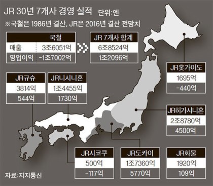 ​6. 일본 철도 독점해체 30년... → 국영철도 1987년 7개 JR 회사로 분할 민영화. 30년만에 연 2조엔 적자서 1조엔 흑자. 그러나 지방 적자 노선 폐지 등 잃은 것도 많아...(중앙)▼