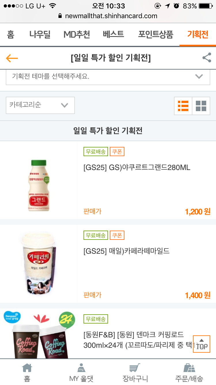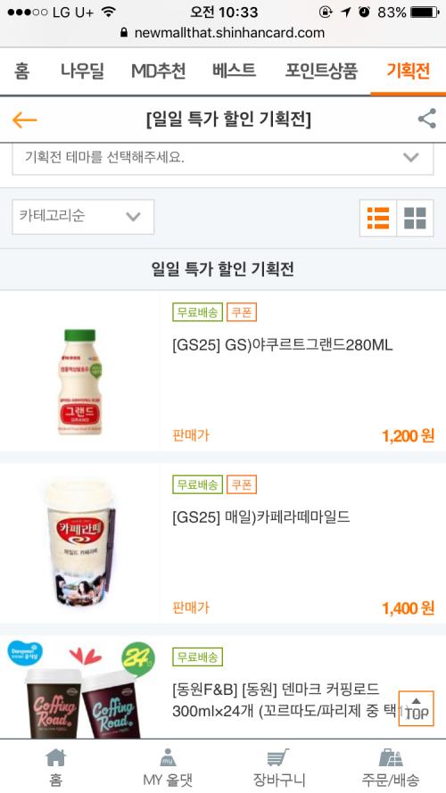 야쿠르트는 앱에서, 카페라떼는 위 주소 웹에서 구매해 보세요. 지금 카페라떼는 앱에서 적용이 안 된다고 하네요...^^ | ||