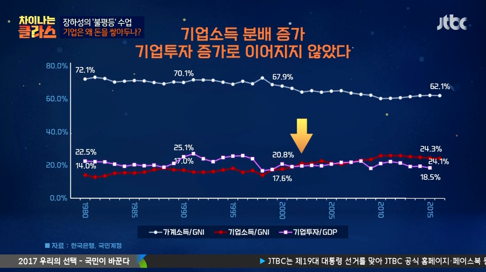 그래프를 보면 1980-2015년 까지 가계의 소득은 줄어들었고, 기업의 투자 역시 줄어들었지만 기업의 소득은 꾸준히 늘었음을 알 수 있습니다.