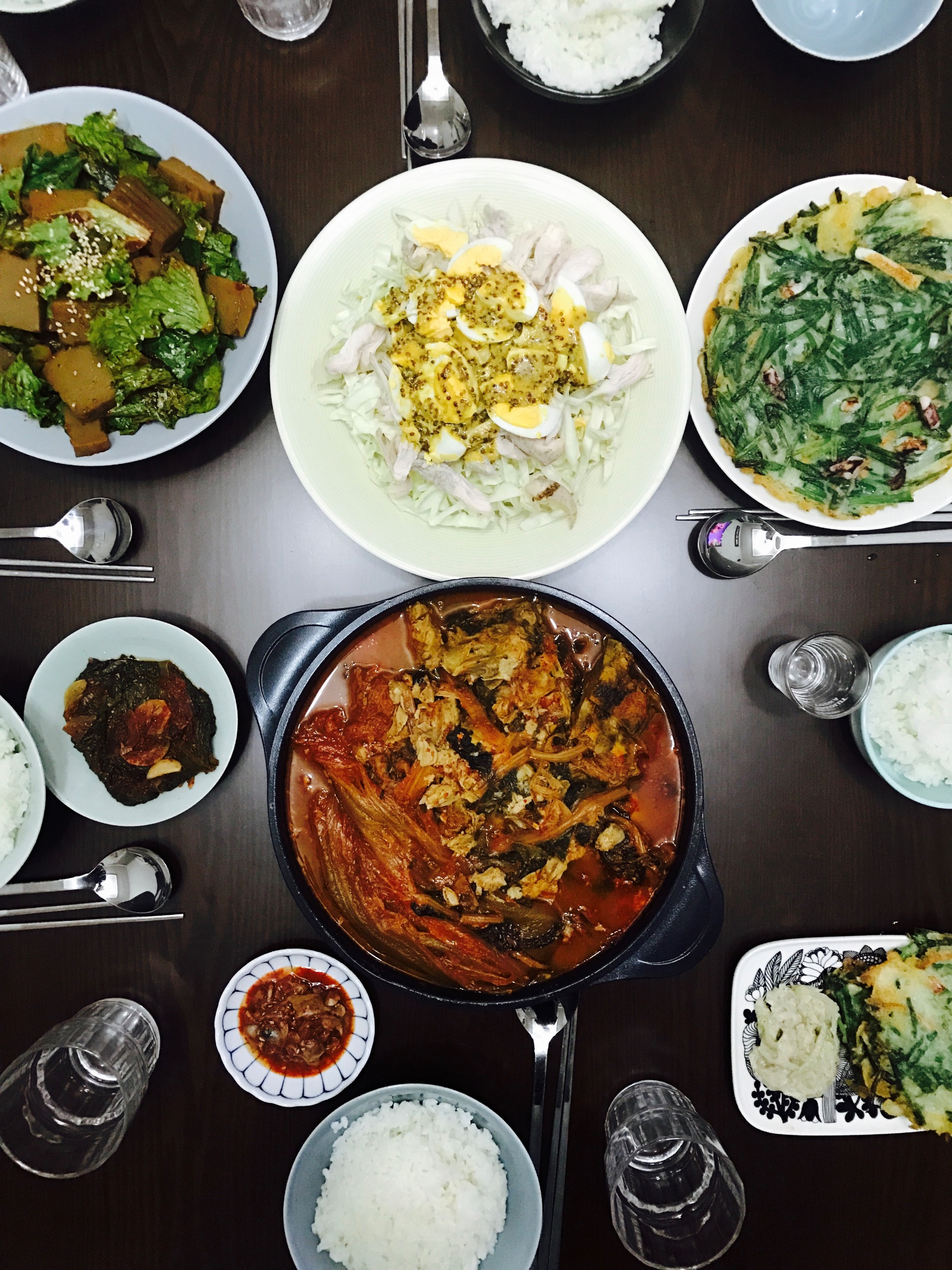시래기도 넣은 묵은지등뼈찜 과 부추오징어전 , 도토리묵무침, 친정엄마가 샐러드 좋아하셔서 만들어본 닭가슴살 겨자샐러드 예요.