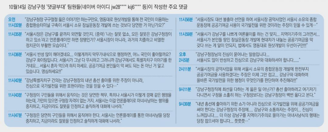 강남구청 ‘댓글부대’로 지목된 시민의식선진화팀 팀원들은 신연희 강남구청장이 지난 10월15일 구의회에 출석하기 하루 전날 인터넷 포털사이트에 올라온 각종 현안 기사에 댓글 폭탄을 퍼부었다.