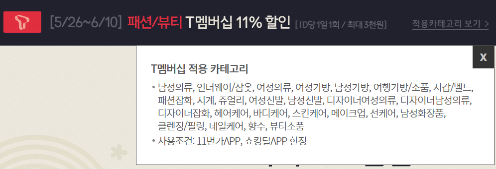 오늘부터 ~ 6/10일까지 패션/뷰티 T멤버십 할인 하고요.