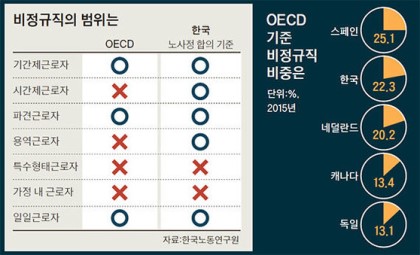 8. 비정규직의 규모? → 법적 기준 없어... 재계와 통계청은 근체 근로자 중 33%, 노동계는 53% 주장. OECD 기준하면22%... 스페인(35%)보다 낮고 독일(13%)보다는 높아. 네덜란드(20%)와 비슷.(매경 외▼)