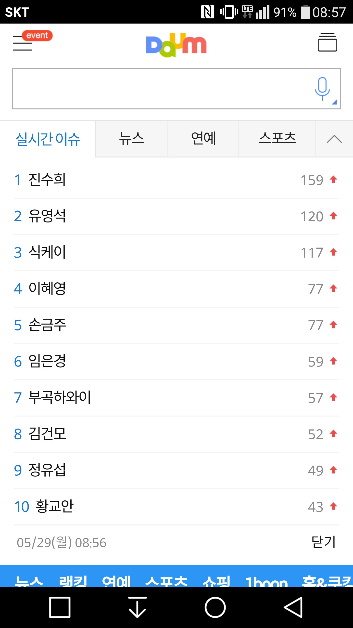 다음 들어가니 실시간 이슈에 사람 이름만 보여서 열어보니 10개 중에 9개는 사람이고 하나만 부곡하와이네요.. 황교안은 10등...