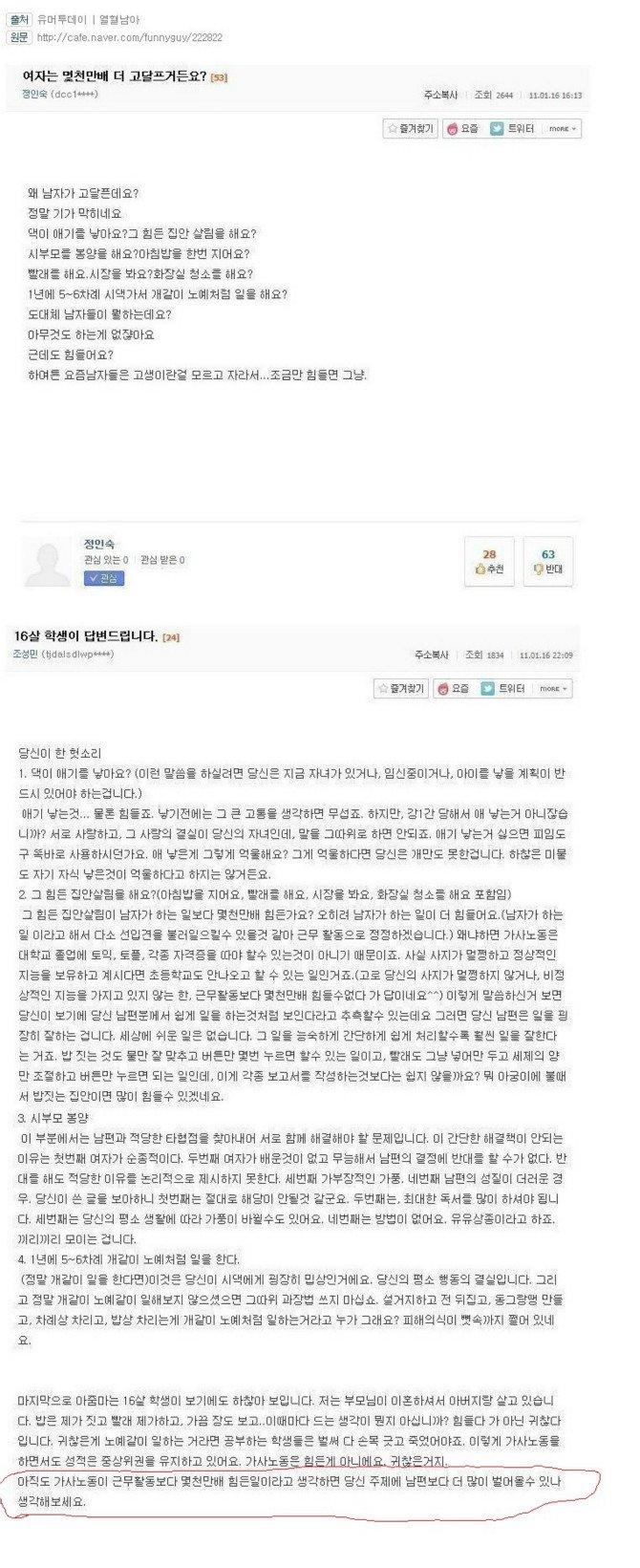 원글이 맞벌이인지 전업주부인지 언급이 없는데 학생은 전업주부로 가정하고 글을 썼네요. 전업주부라 하더라도 답변중 잘못된 부분이 있지만, 여자가 몇천만배 더 고달프다는 원글보다는 훨씬 나은 글로 생각되네요. 원글은 어디서부터 손대야할지 모를만큼 답없는 주장인데 학생의 답변은 조금만 수정하면 잘못된 부분은 없어보이거든요. |