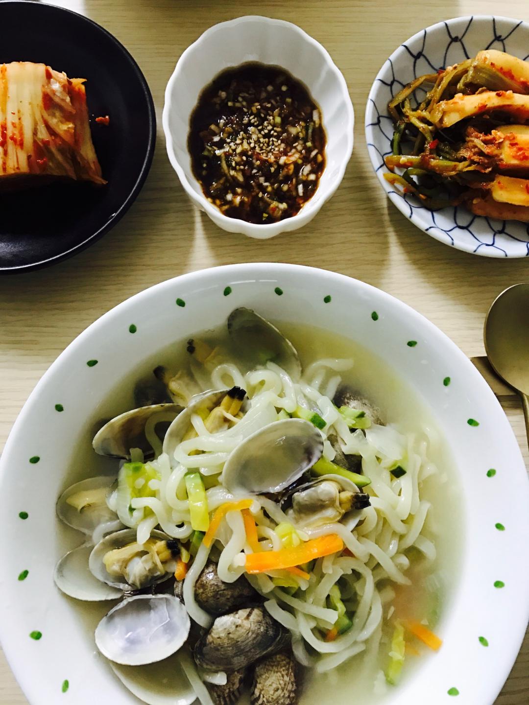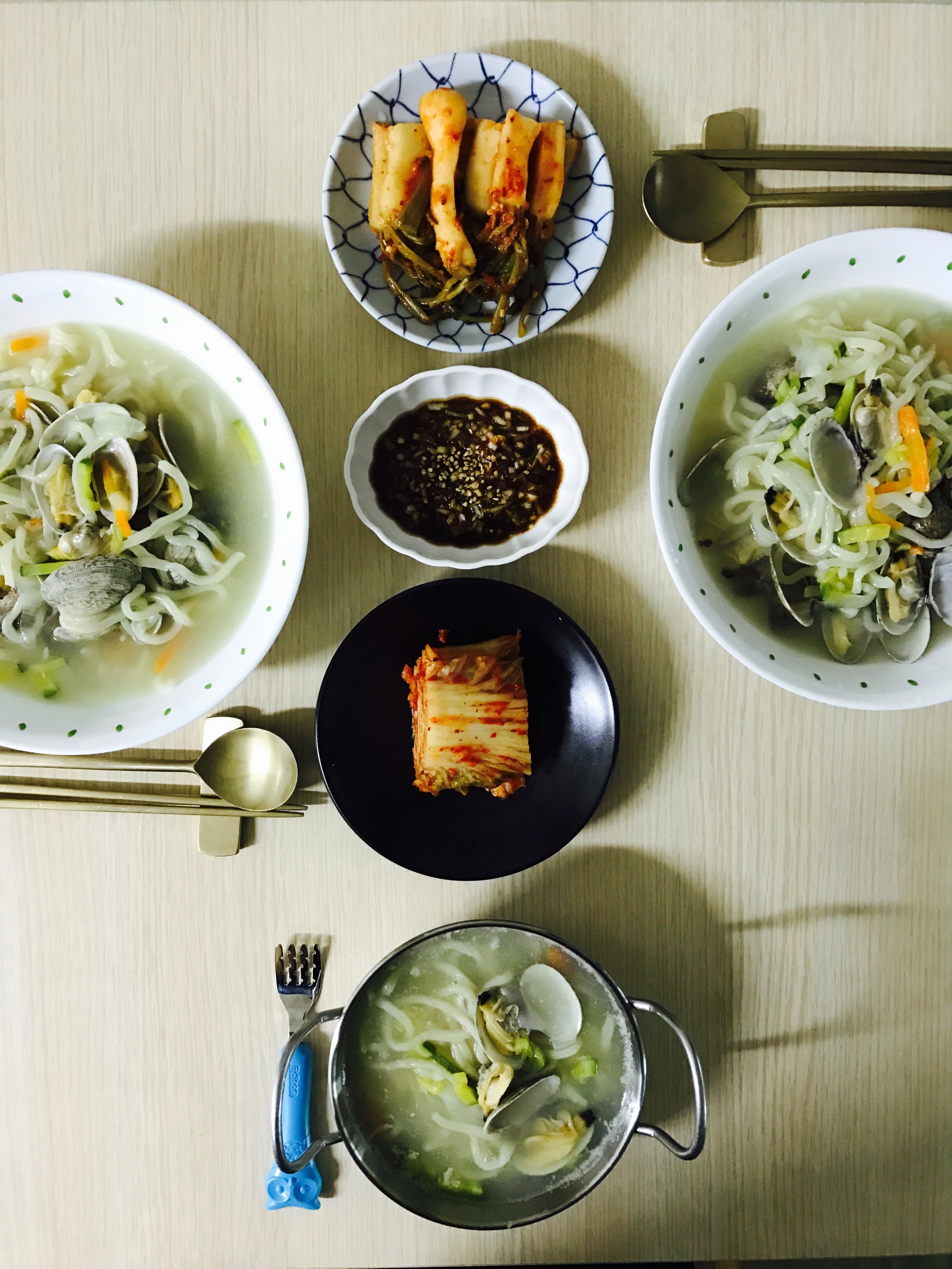 진하게 내놓은 육수에 야채들 넣어 끓여주고, 어느정도 익었을때 실한 바지락 넉넉히 넣어요.