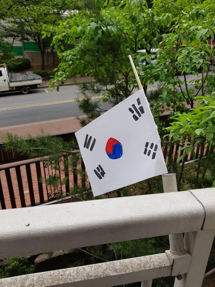 아침에 일어나니 유치원 다니는 딸내미가 태극기 만들고 있더라구요. 완성 후 달아줬습니다 ㅎ