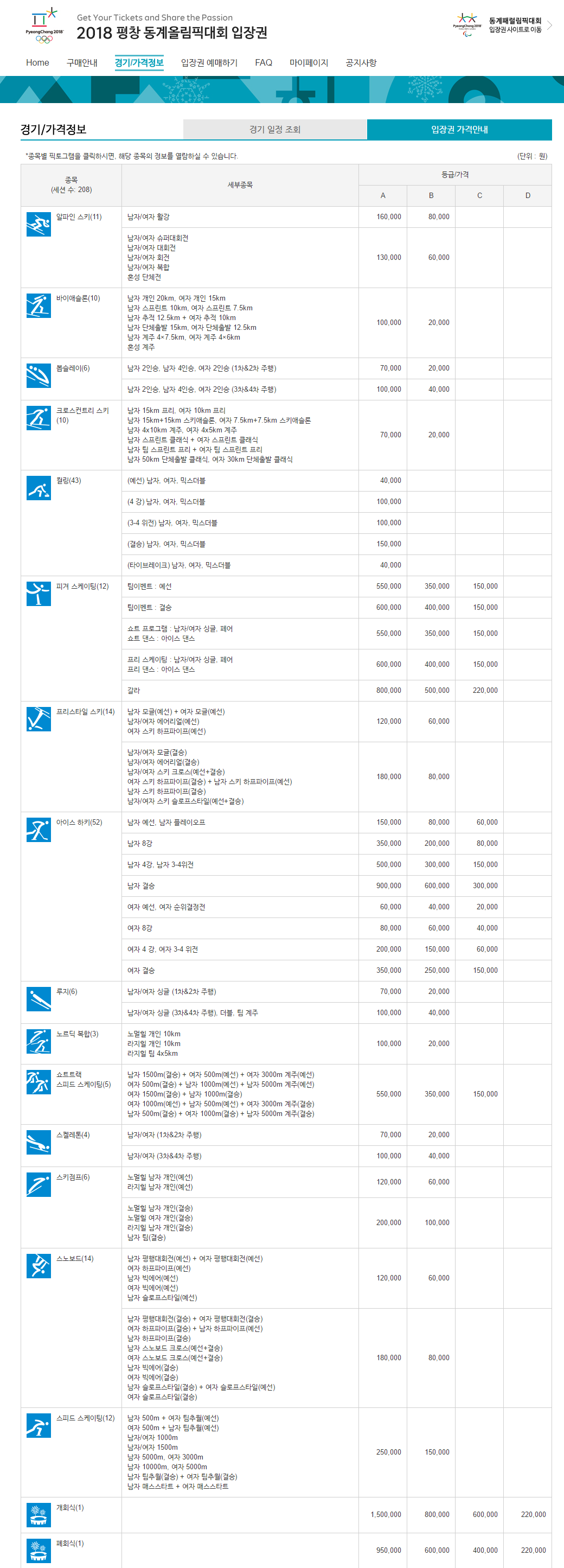 계회식 가격이 150만원 그 외에 한국인에게 인기 있는 종목은 가격이 타 경기 비해 2배는 비싸네요.
