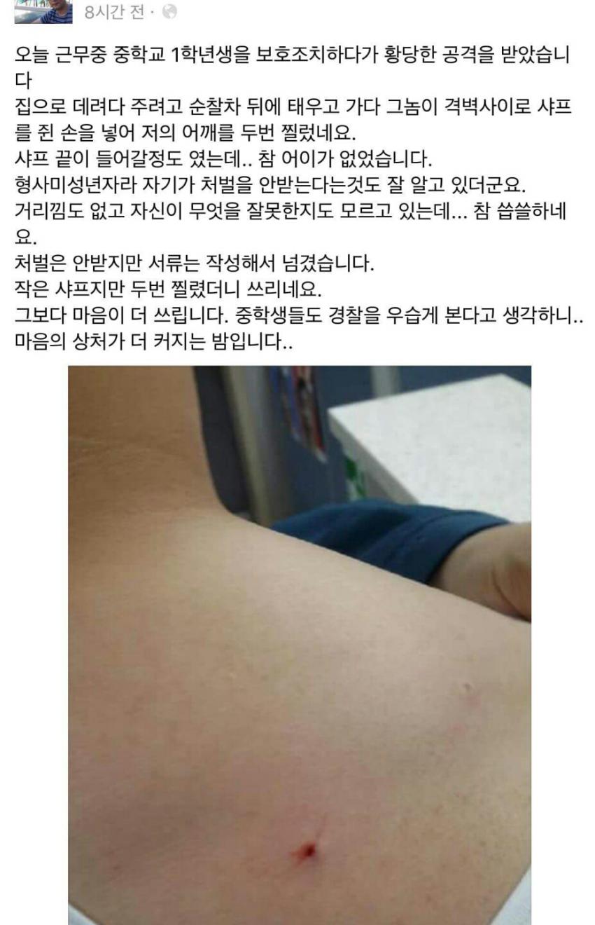 순찰차 안에서 경찰 어깨에 샤프 찔러넣음