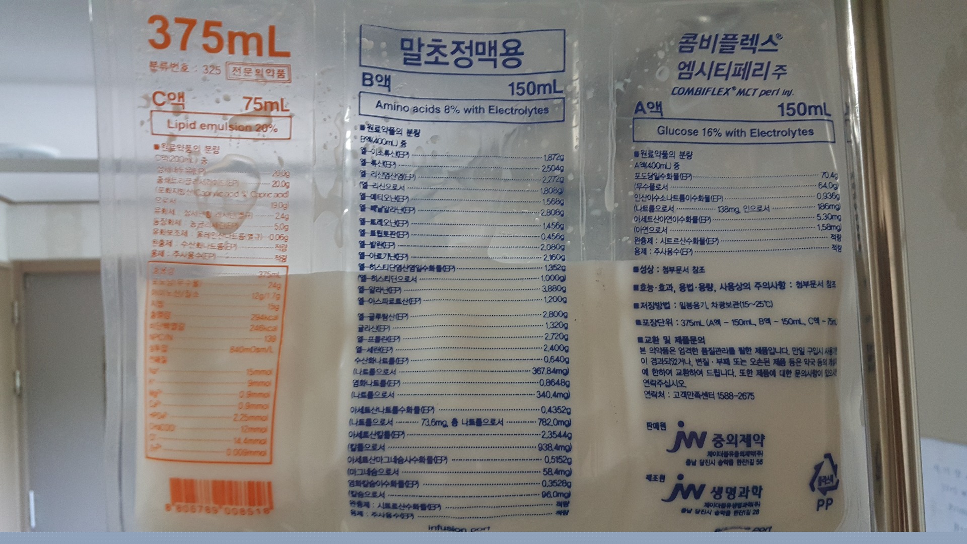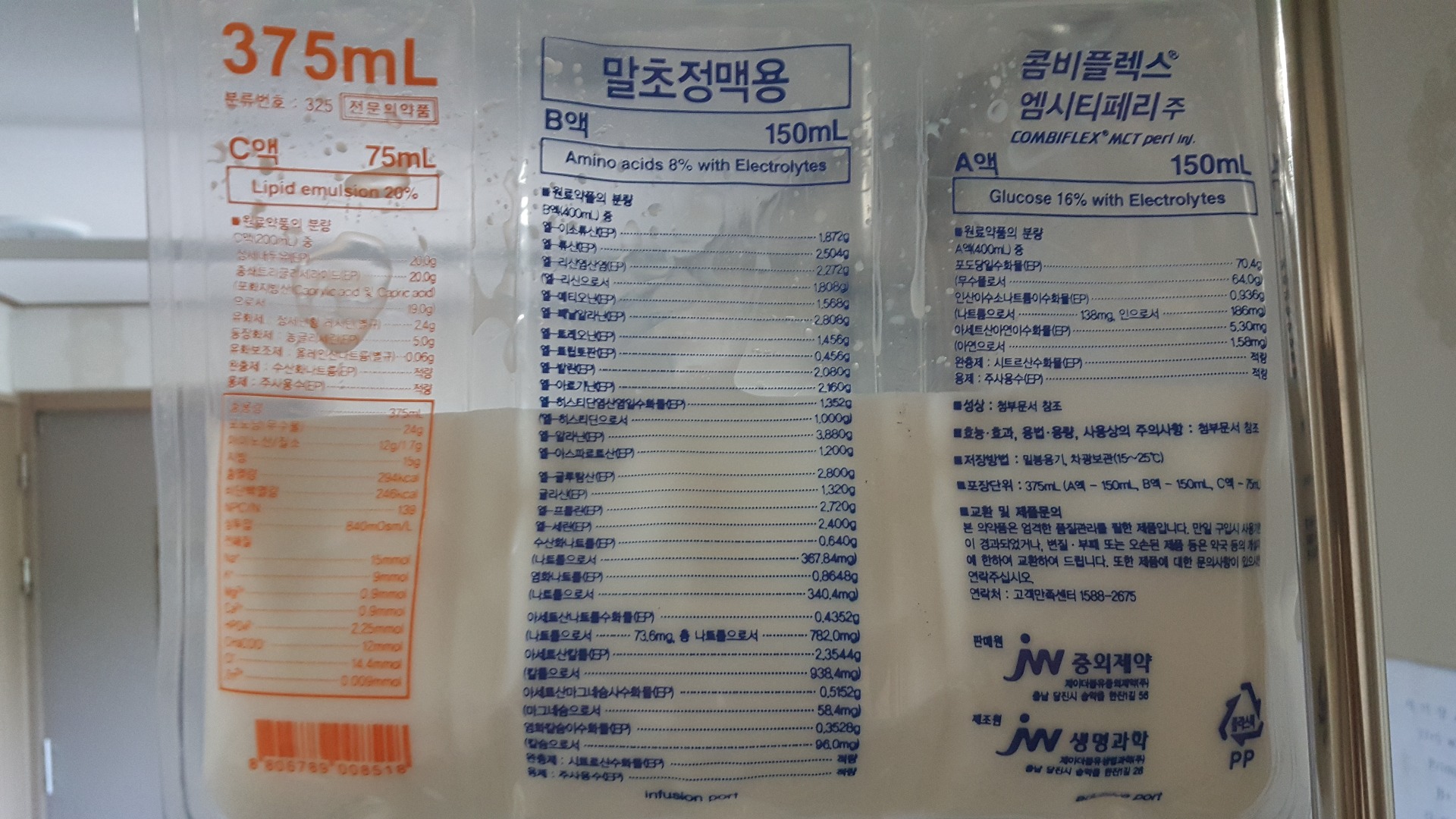 콤비플렉스는 식사못하는 환자.. 가령 식도가 녹아서 입으로 못넣는다거나 의식없어 경구섭취 안되는 환자만 장외영양으로 보험급여 되구 일반적으로 음식 섭취 되는 환자 맞길 원하면 비보험으로 비싸요 ㅋ 일반적인 비타민 영양제랑 달라요~ 포도당용액에 비타민 섞은건 비보험해도 만얼마정도
