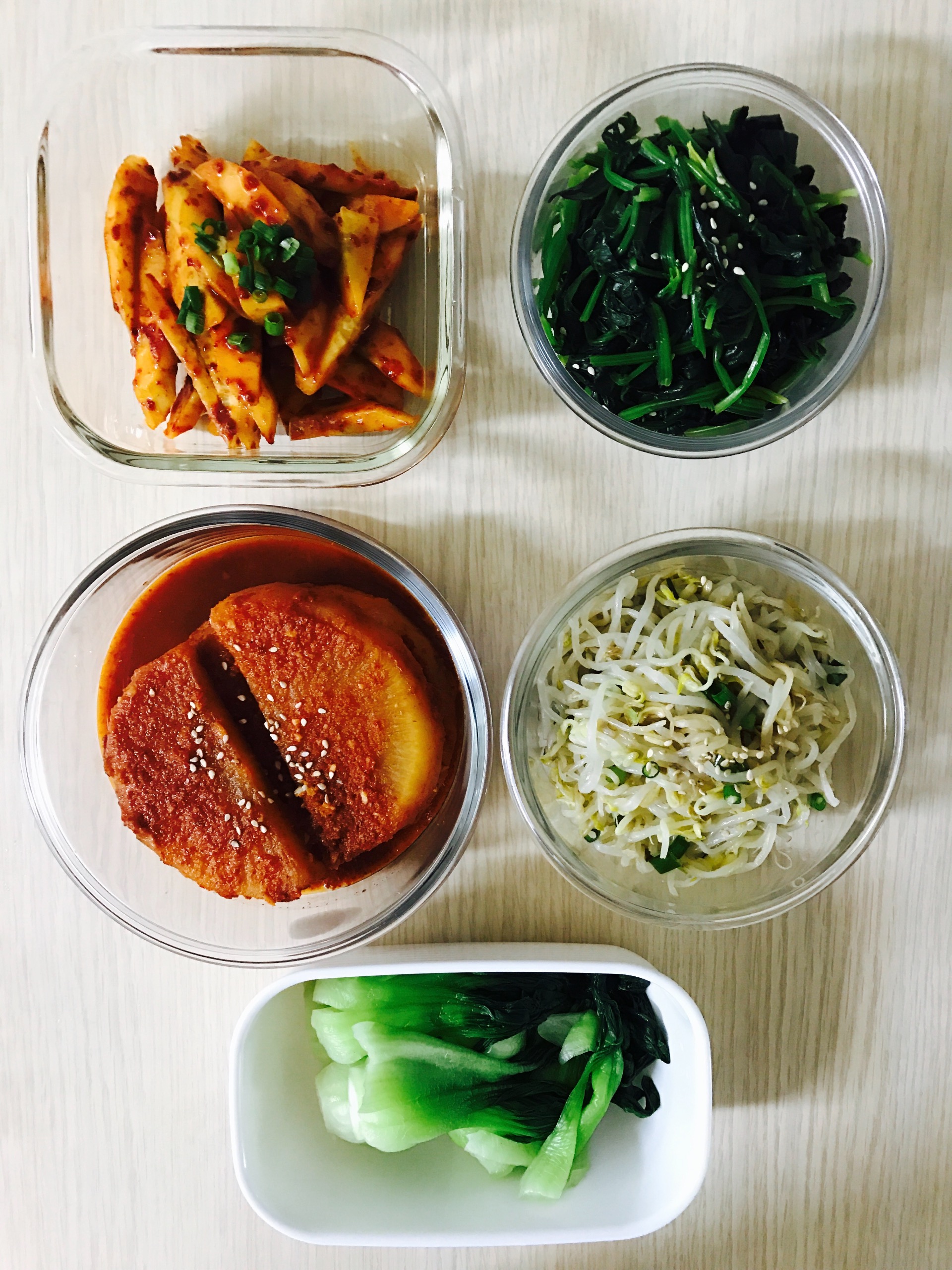 오이무침 과, 시금치나물, 숙주나물, 육수내면서 넣어서 건져둔 무에 양념장 넣어 졸인 무조림이예요: