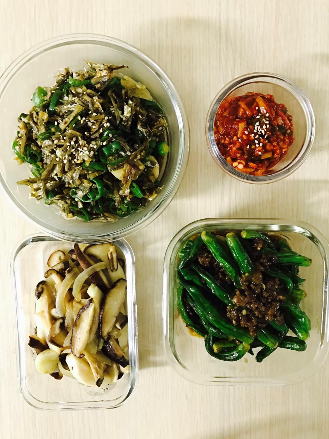 저녁 찬은 고추장물 과, 오징어젓갈무침, 버섯볶음, 꽈리고추소고기볶음 이예요.
