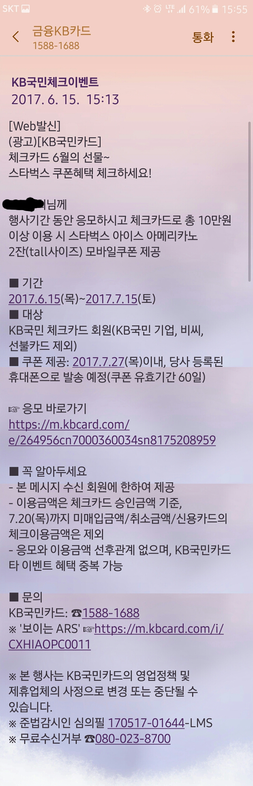 저도 체카 만들어놓고 거의 사용 안 했는데.... 문자가 안 오네요.