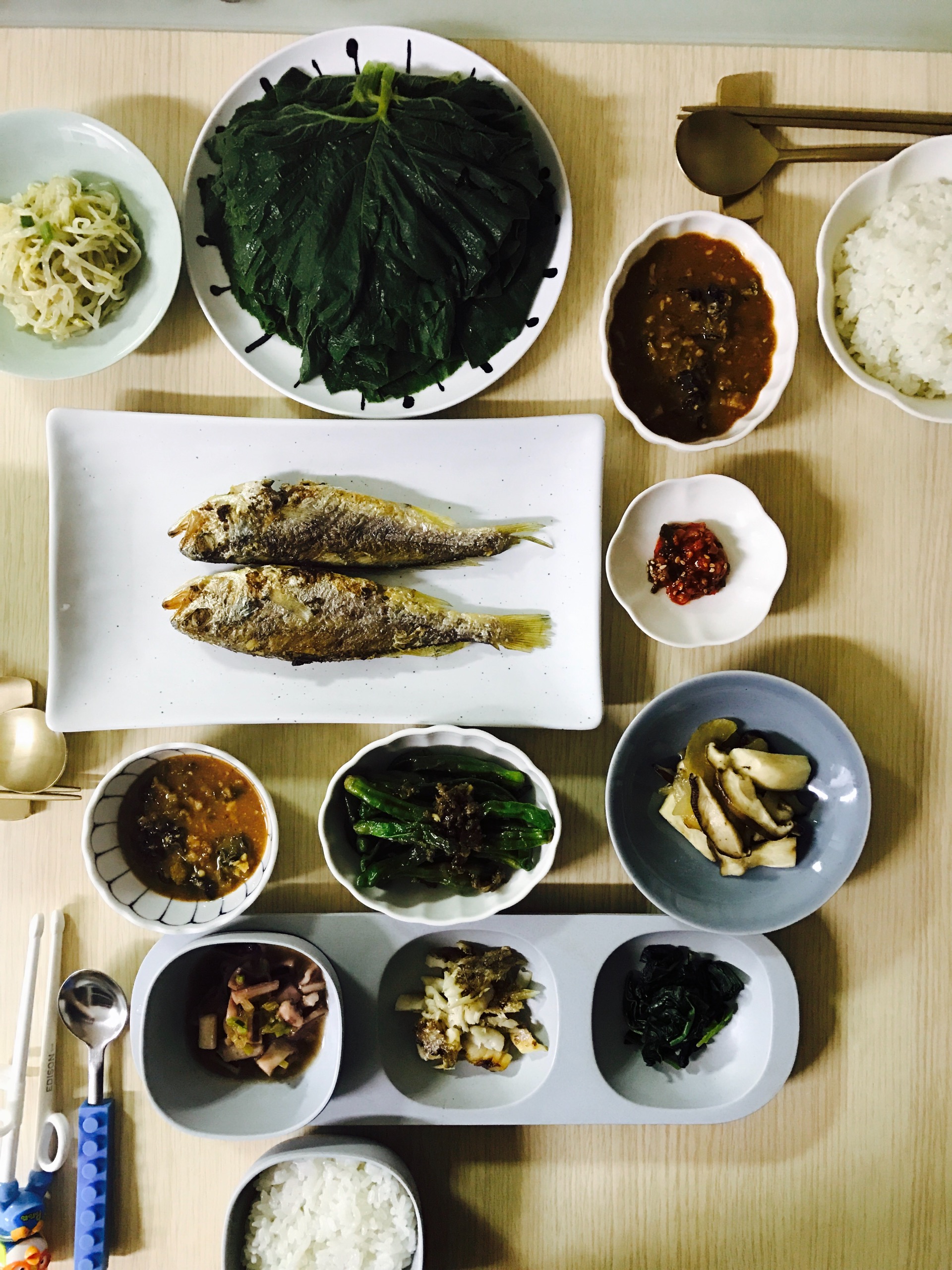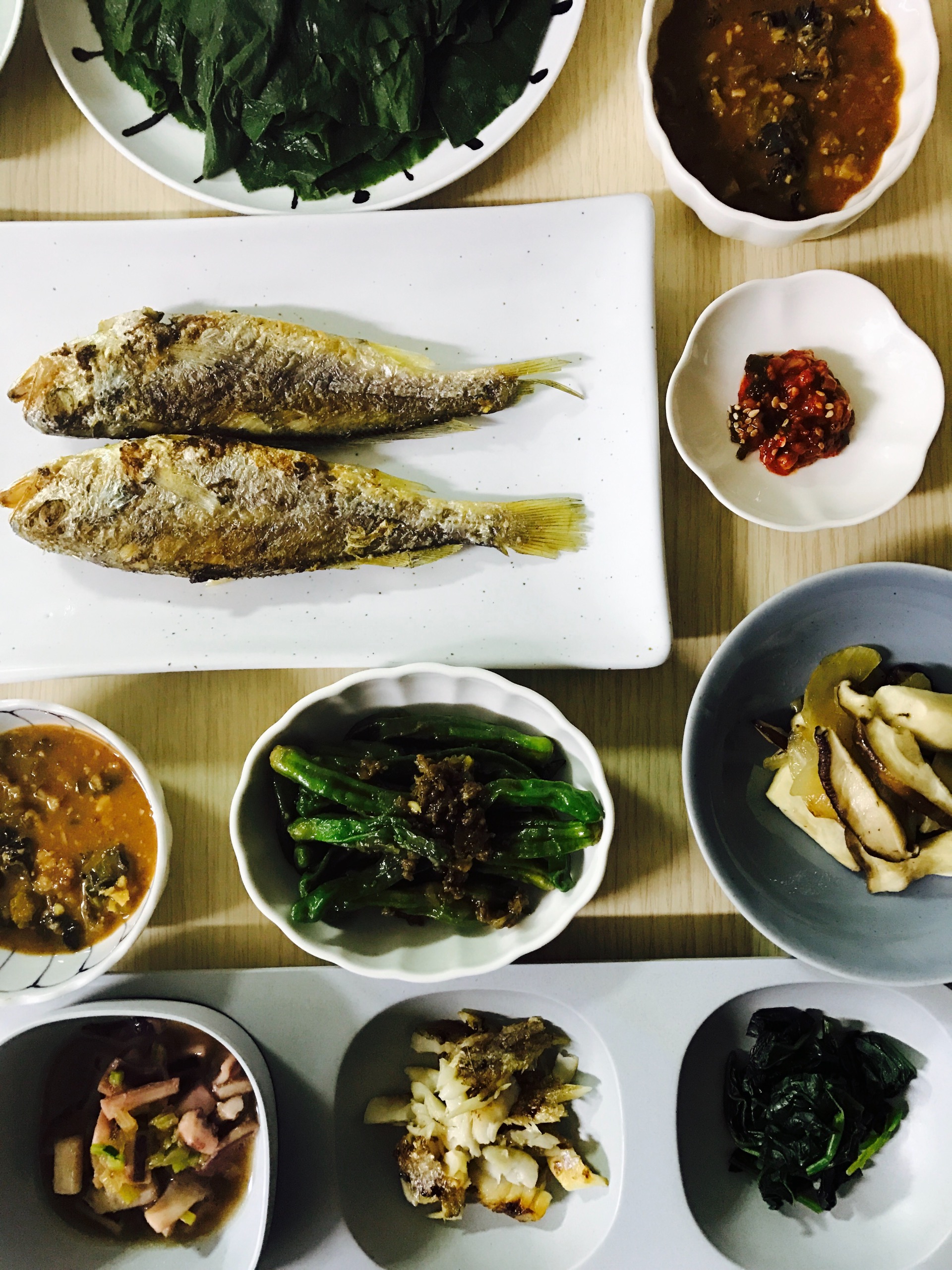 호박잎 찌고, 우렁 넣어 강된장 만들고, 조기도 구워냈어요.