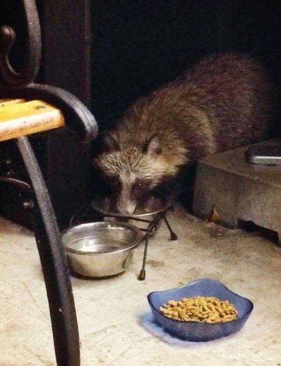 너구리에게 사료를 주었더니 밤 알갱이 가져옴..