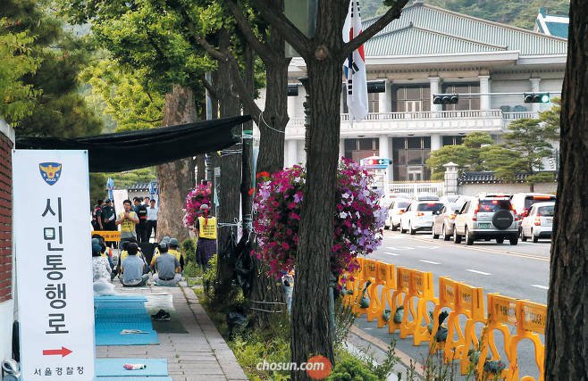 월요일? 그 때 개방한다고 발표하자마자 몇 시간 후에 저렇게 불법 점거하고 청와대쪽으로 확성기 빵빵하게 구호 외치시는 중이라고 ㅋㅋㅋㅋ