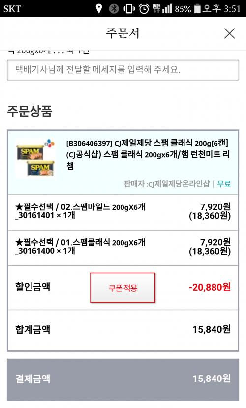 저도 옥션에서 스팸 200g 6개짜리 청춘쿠폰이랑 cj쿠폰으로 5천원에산거 이제 오고있습니다~ | ||