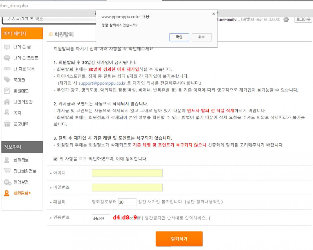 의미는 없지만 아이디는 지웠습니다. 30일동안 가입안된답니다. 탈퇴버튼을 누르니 진짜할건지 물어봅니다.