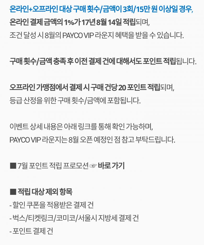 온라인 페이코 결재 건에 대해 결재금액 1% 적립도 이제 15만원이상 구매자만 해당되네요.(3건이상구매)