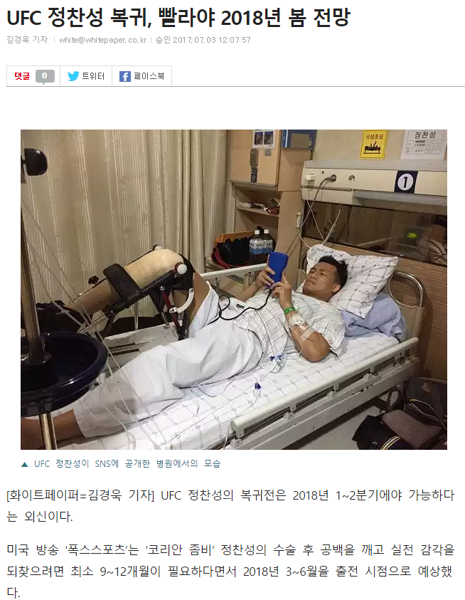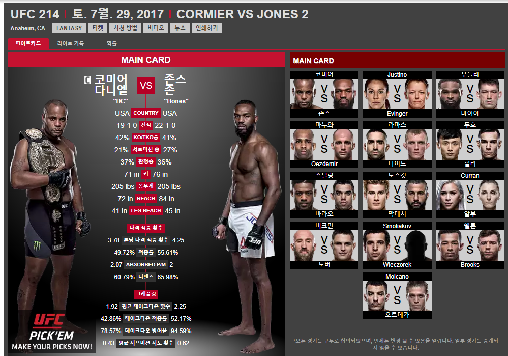 참고로 UFC214에서 정찬성도 경기가 잡혔던거로 알고있는데 무릎 수술을 하면서 내년에나 경기 할 수 있다고 하네요.